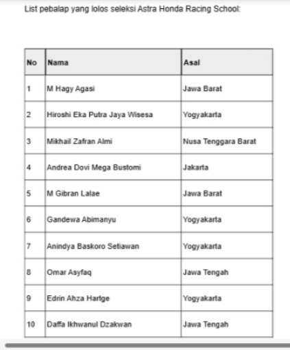 Seleksi dilakukan secara bertahap dengan penilaian komprehensif terhadap berbagai aspek teknik balap, mulai dari riding position, braking, racing line, cornering, body movement, hingga spatial awareness. Selain kemampuan teknis, konsistensi performa, daya tahan fisik, serta kemampuan adaptasi terhadap lintasan baru juga menjadi indikator penting dalam proses penilaian. Setelah melalui tahapan seleksi tersebut, terpilih 10 pebalap terbaik yang dinilai memiliki potensi kuat untuk dikembangkan melalui pembinaan AHRS.